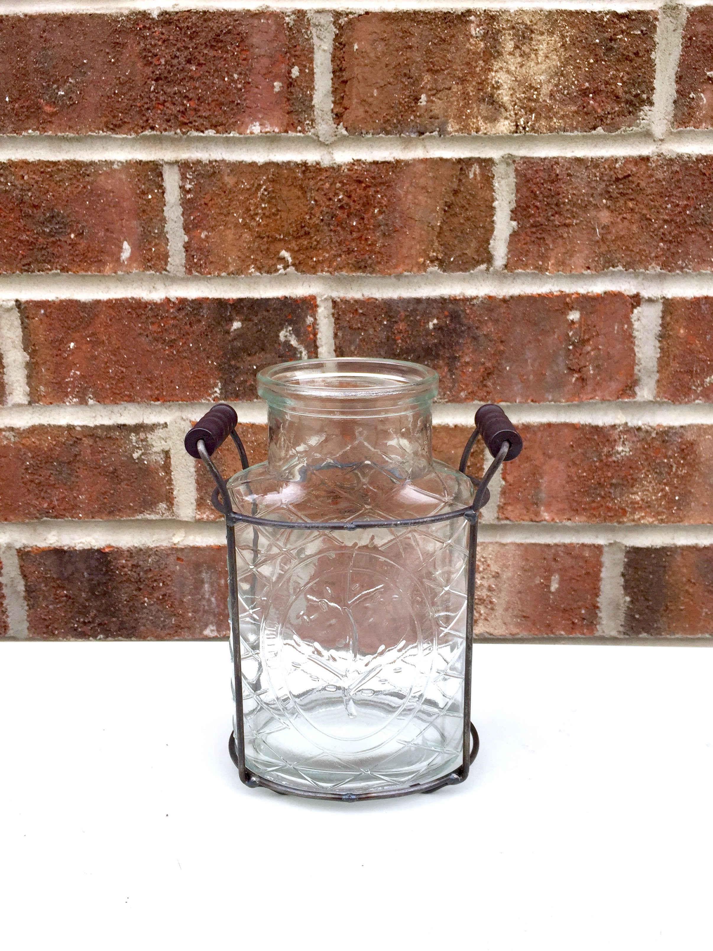 Patterned oblong clear glass vases with metal holders and metal lid