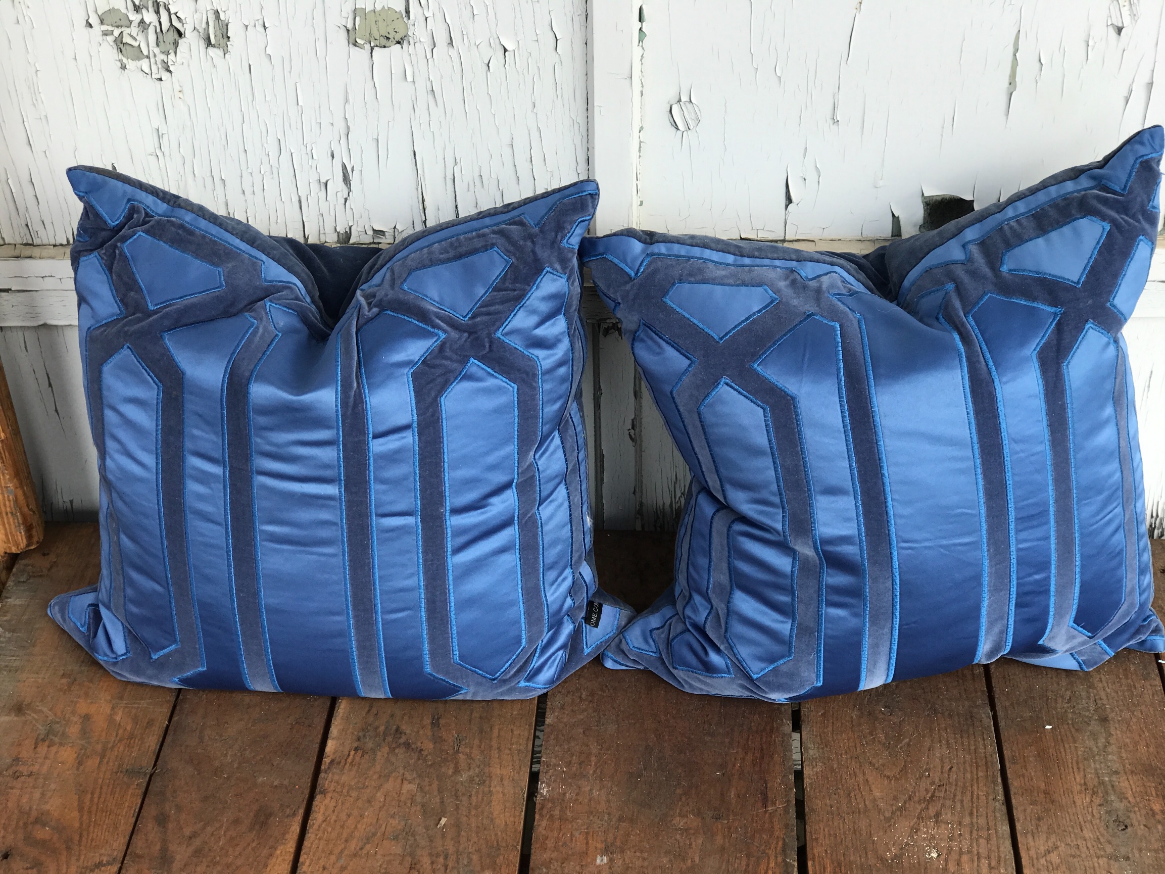 Blue Velvet Pillow with Geometric Pattern