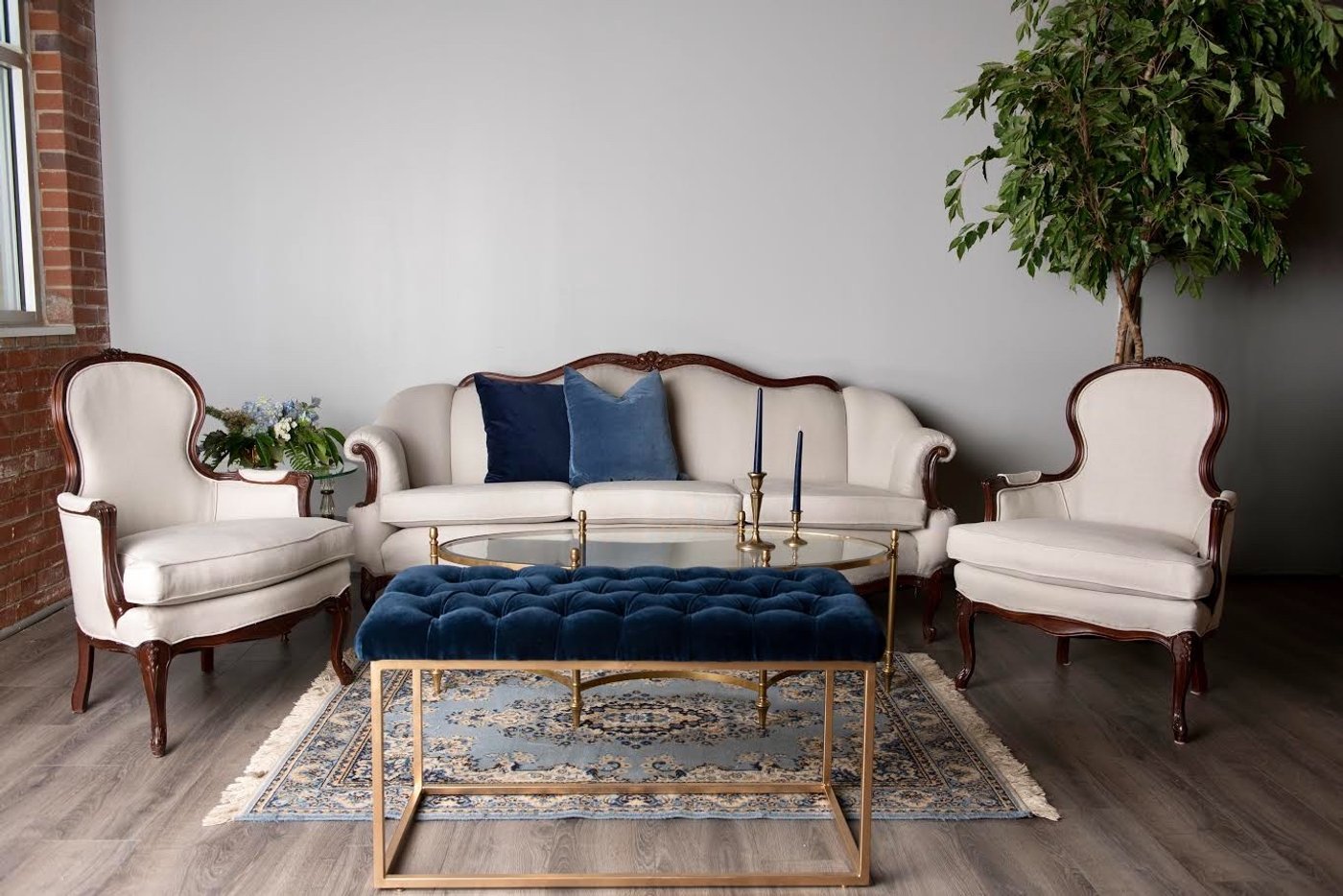 Conservative off-white and shades of blue are showcased in this lounge and once your guests sit down, they will stay all night. This is one of our most popular lounges. Audrey and Antoinette are cut out of the same cloth and when you add our blue velvet tufted bench, vintage tables, rug, and 2 pillows...well, it looks marvelous!