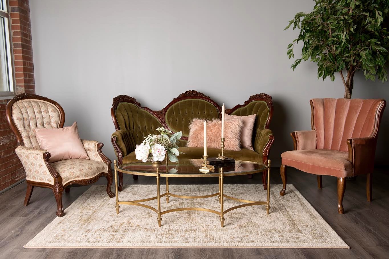 Soothing to the eyes is what best describes our Idlewood Lounge. With seating for five, Lottie makes everything look good with her tufting and moss green velvet. Creams and peach round out the soft seating of this lounge, plus a neutral rug, pillows, and vintage brass coffee table. Classic and beautiful!
