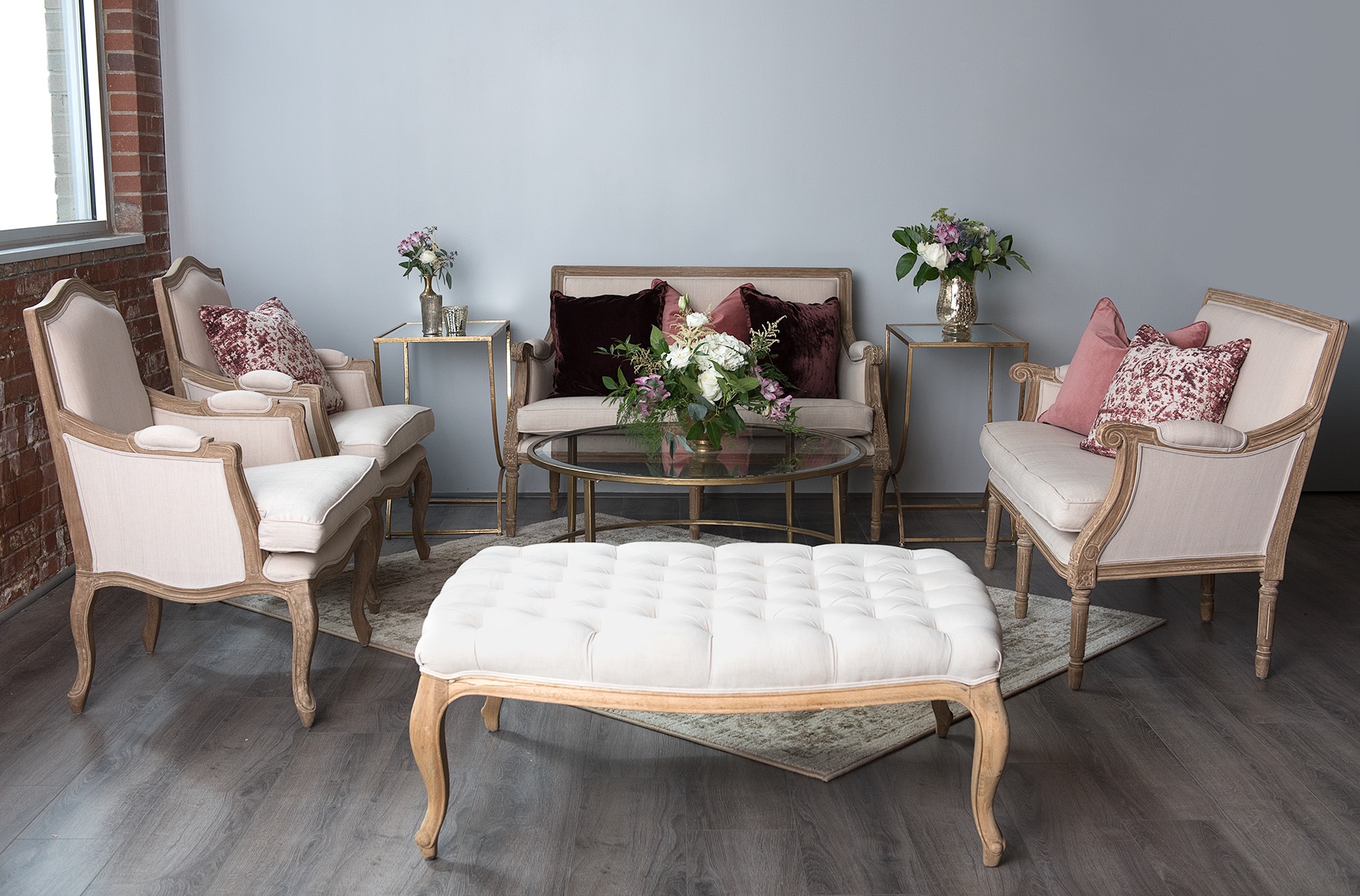 Pink, burgundy, and cream pillows make this lounge both beautiful and timeless. The Irving seats up to nine and includes two love seats, a coordinating chair pair, large tufted ottoman, mirrored end tables, a coffee table, 6 pillows, and a rug.