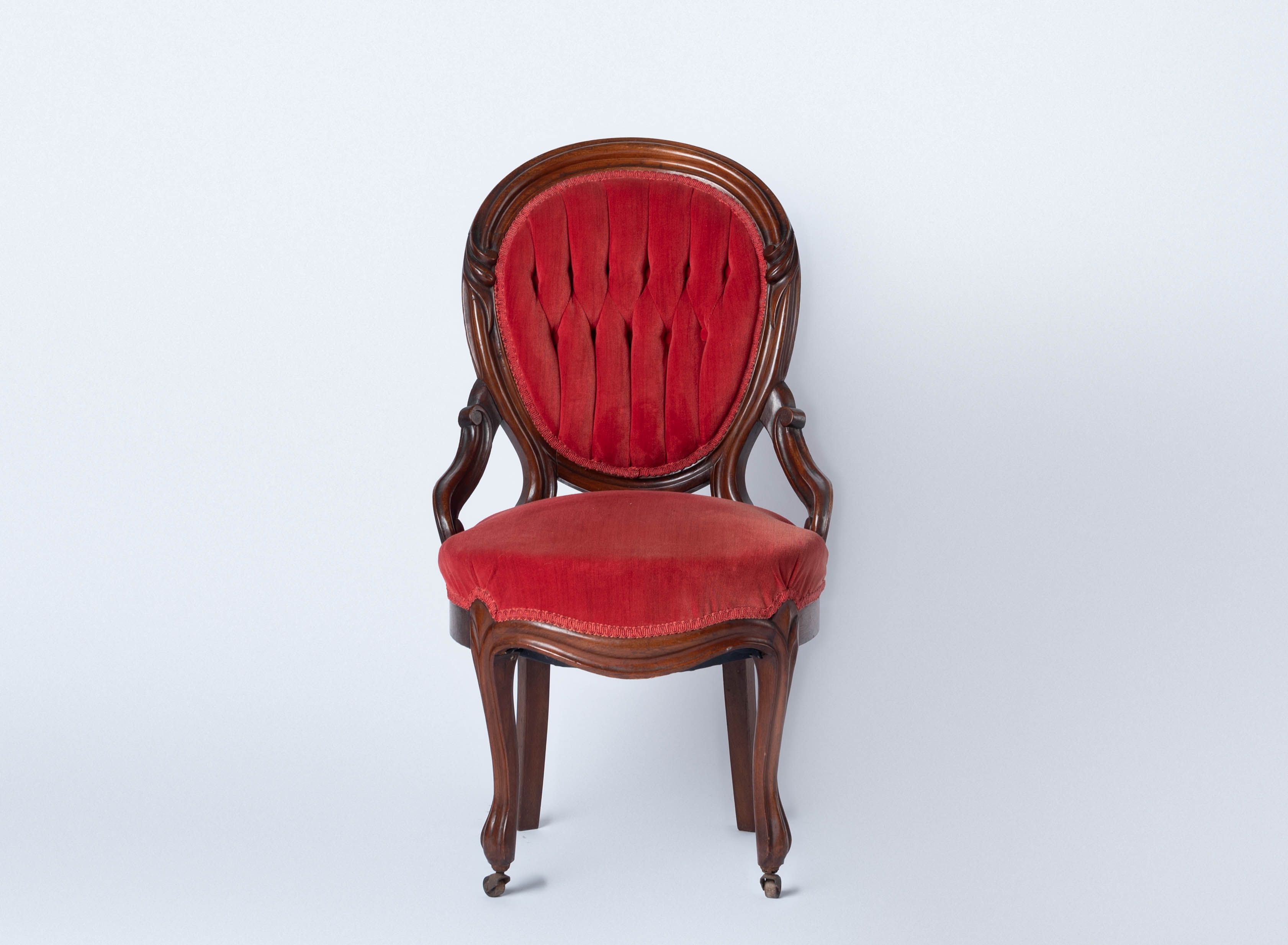 Small red velvet tufted Queen Anne chair