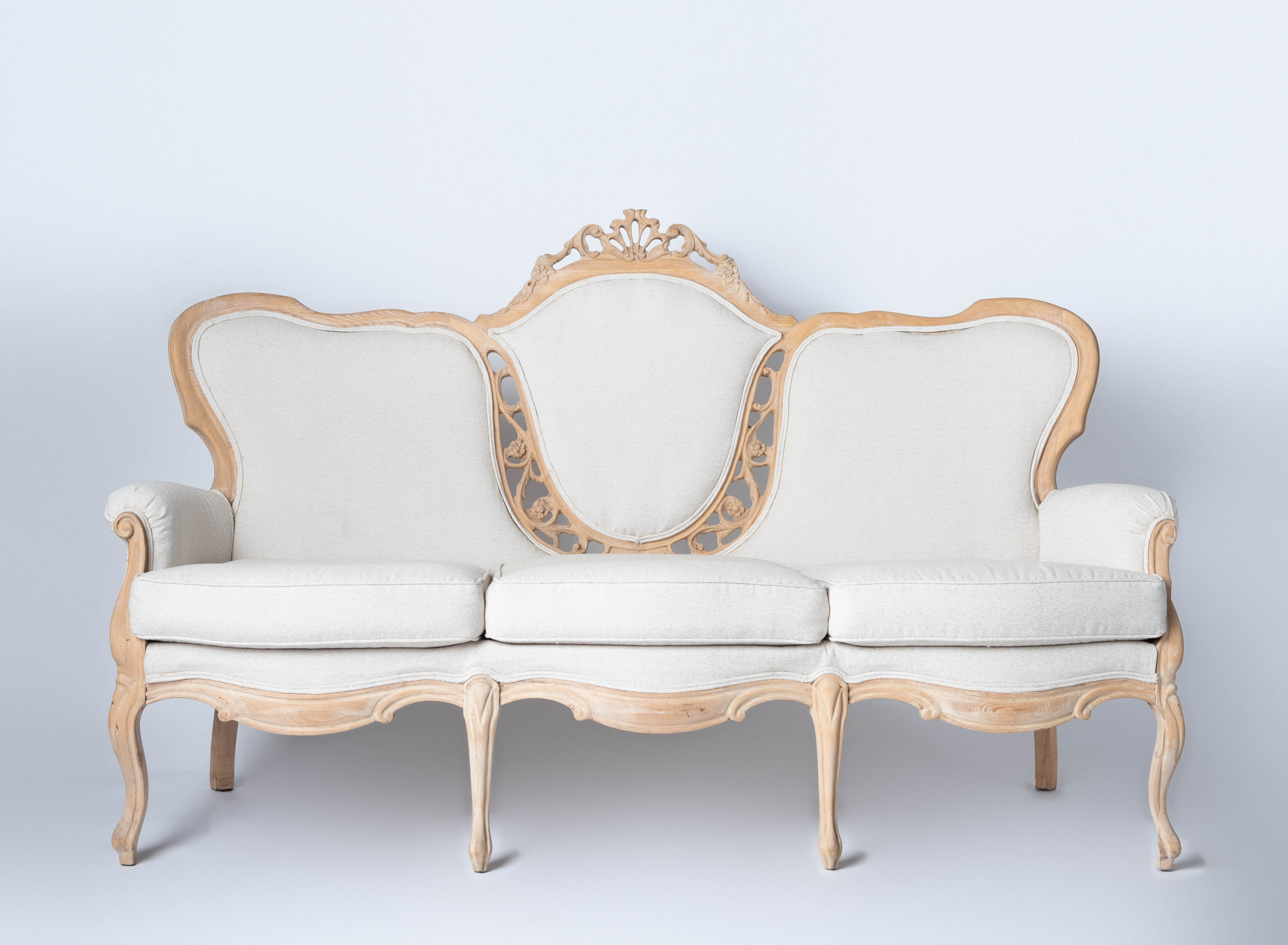 Off-white fabric with carved light wood frame