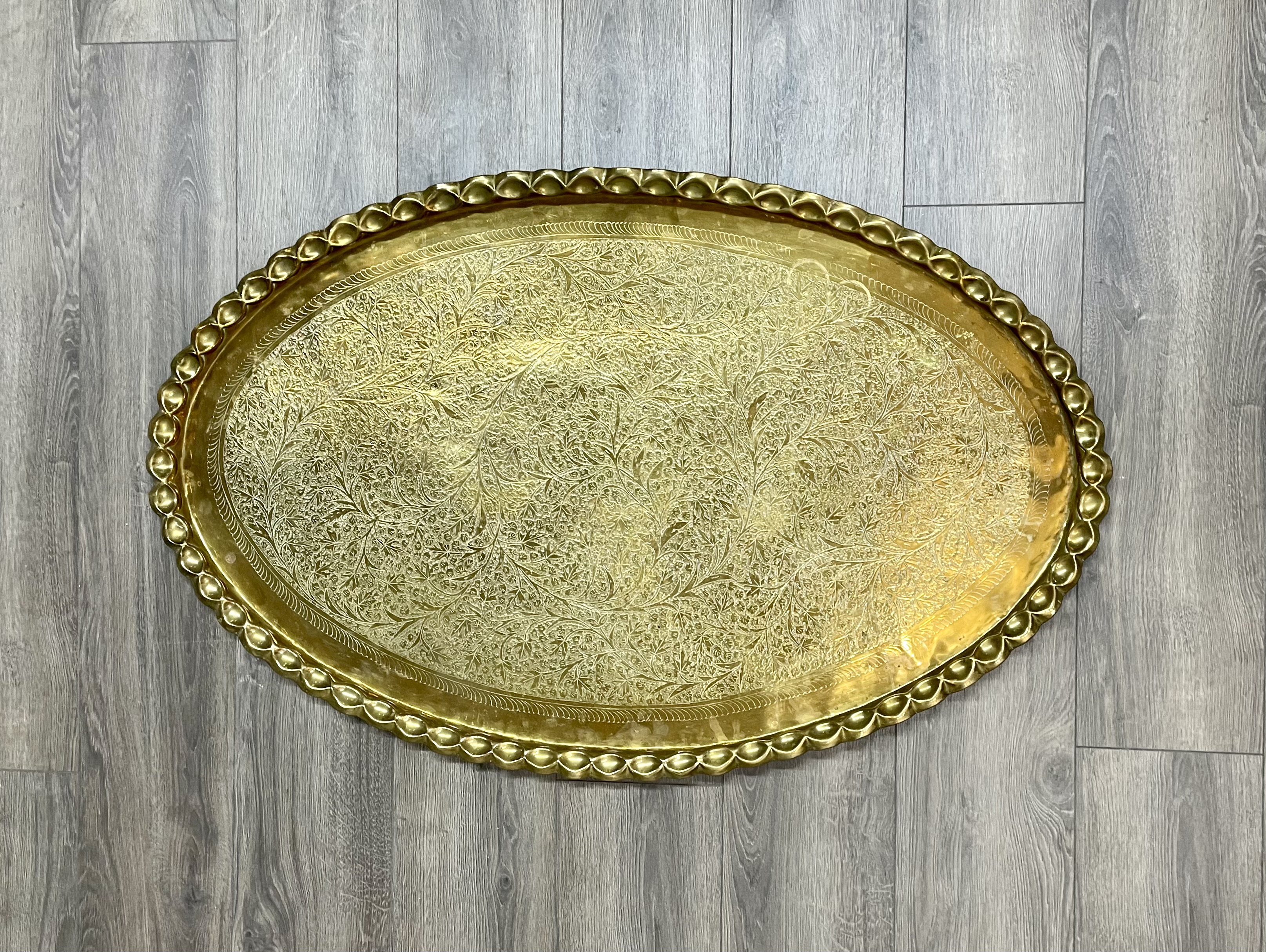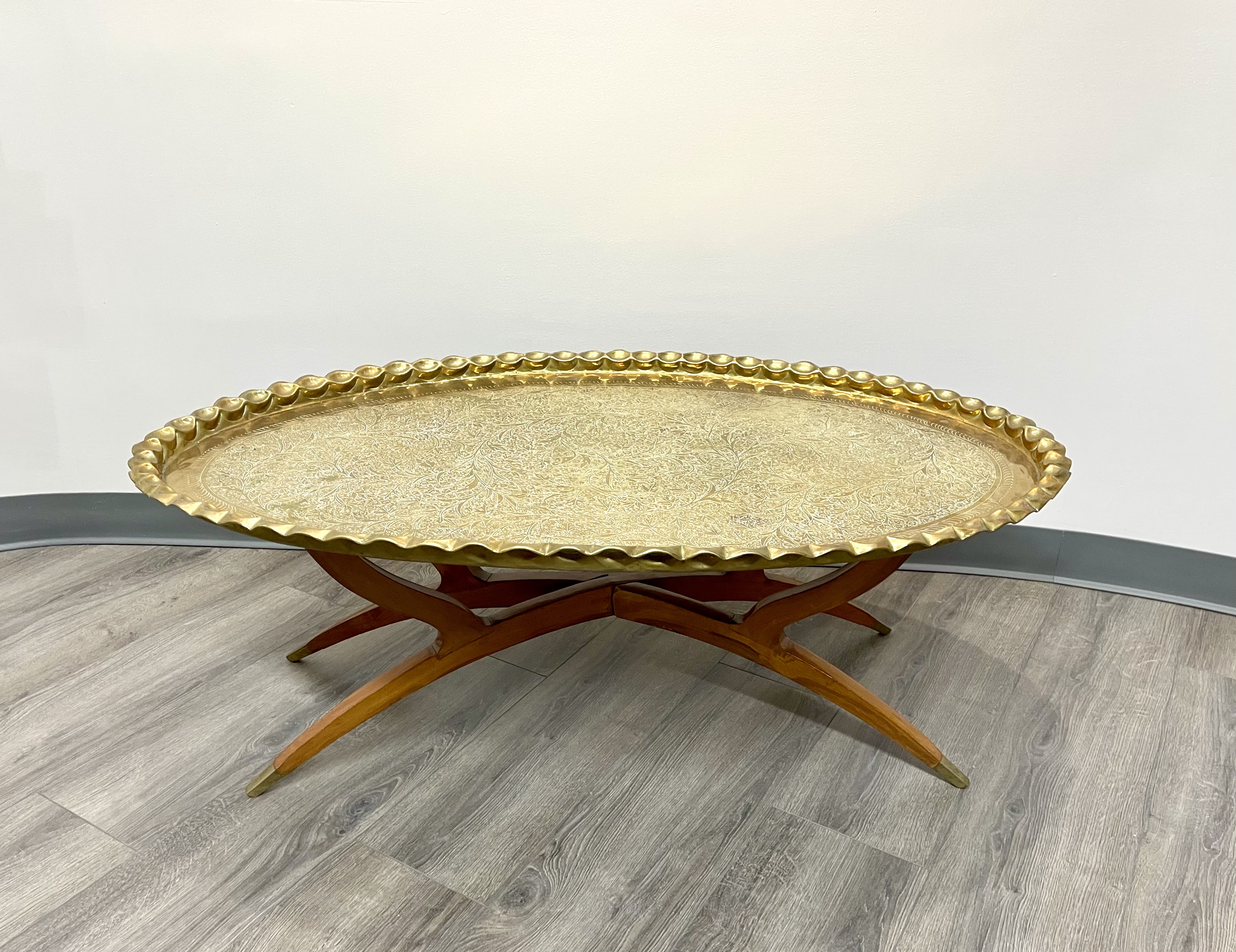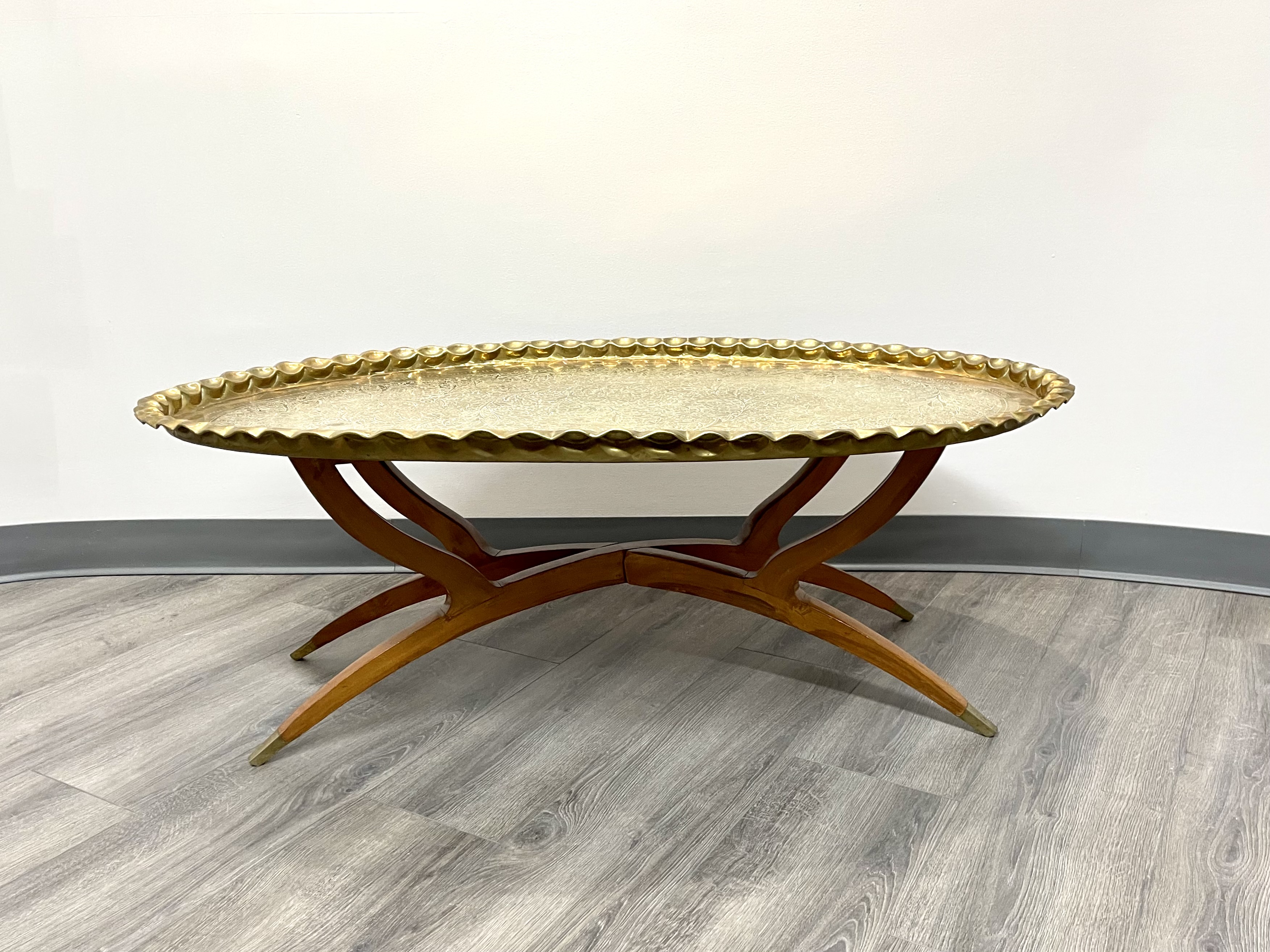 Moroccan Brass Oval Coffee Table with Scalloped Edges and Wooden Base