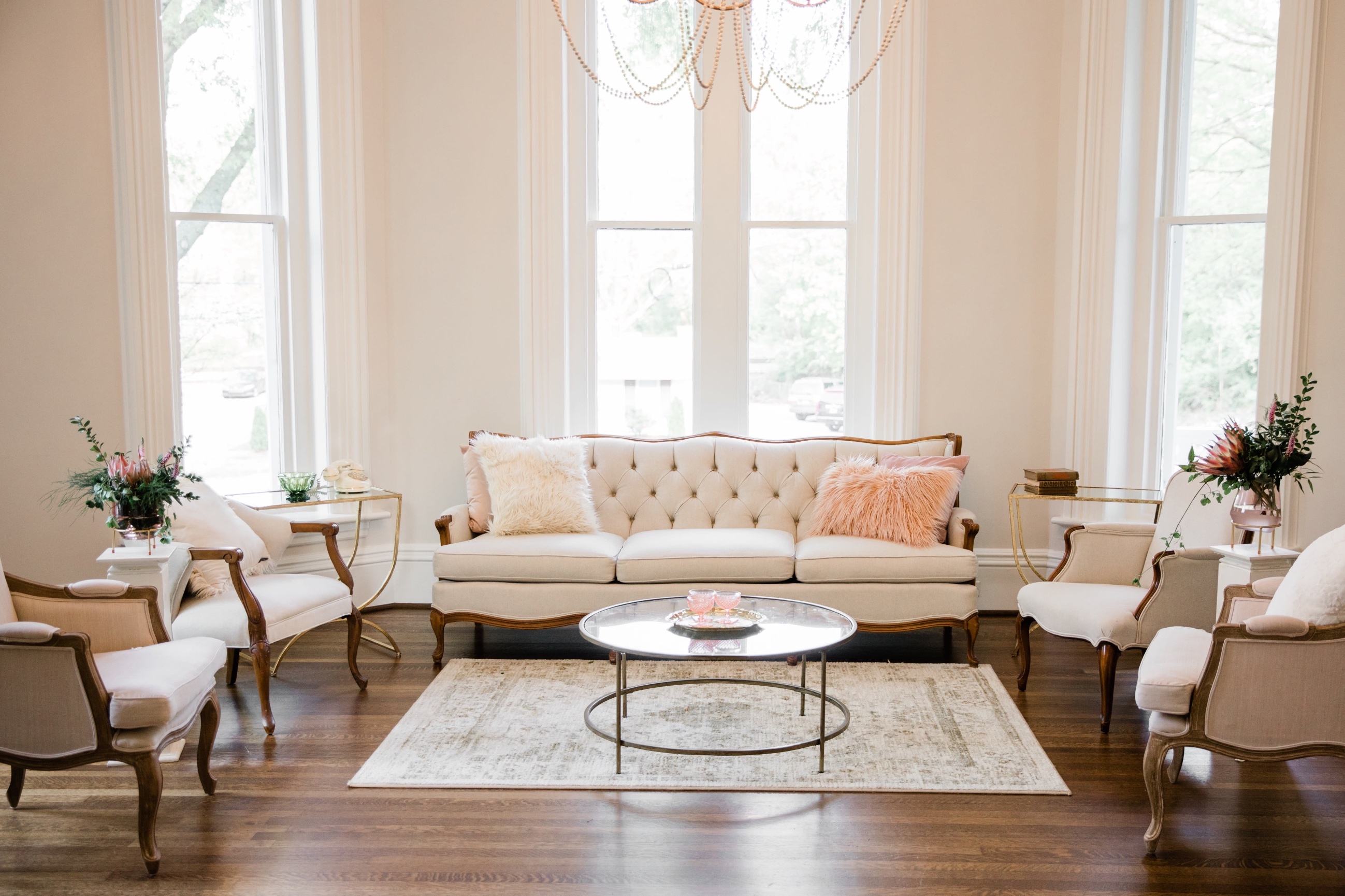 Neutrals tell a story all their own and The Northern Shores Lounge tells the best story of all. Penelope surrounds herself with four linen chairs, white pedestals, gold coffee and end tables, and a neutral rug with grays, cream, and taupe. The best thing about this lounge is that it can go anywhere and if you need a splash of color add in 2 pillows of your choice.