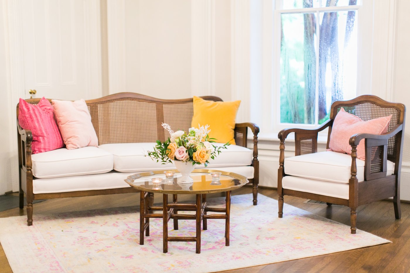 If you are looking for a grouping that is both masculine and feminine, this is your ticket. Cane back seating with soft yet sturdy Sunbrella white fabric will provide the softness and still maintain the strength of the O'Henry Lounge personality. The brass and glass coffee tray table adds interest and style. Rugs and pillows can be adjusted to suit the color scheme of your event.