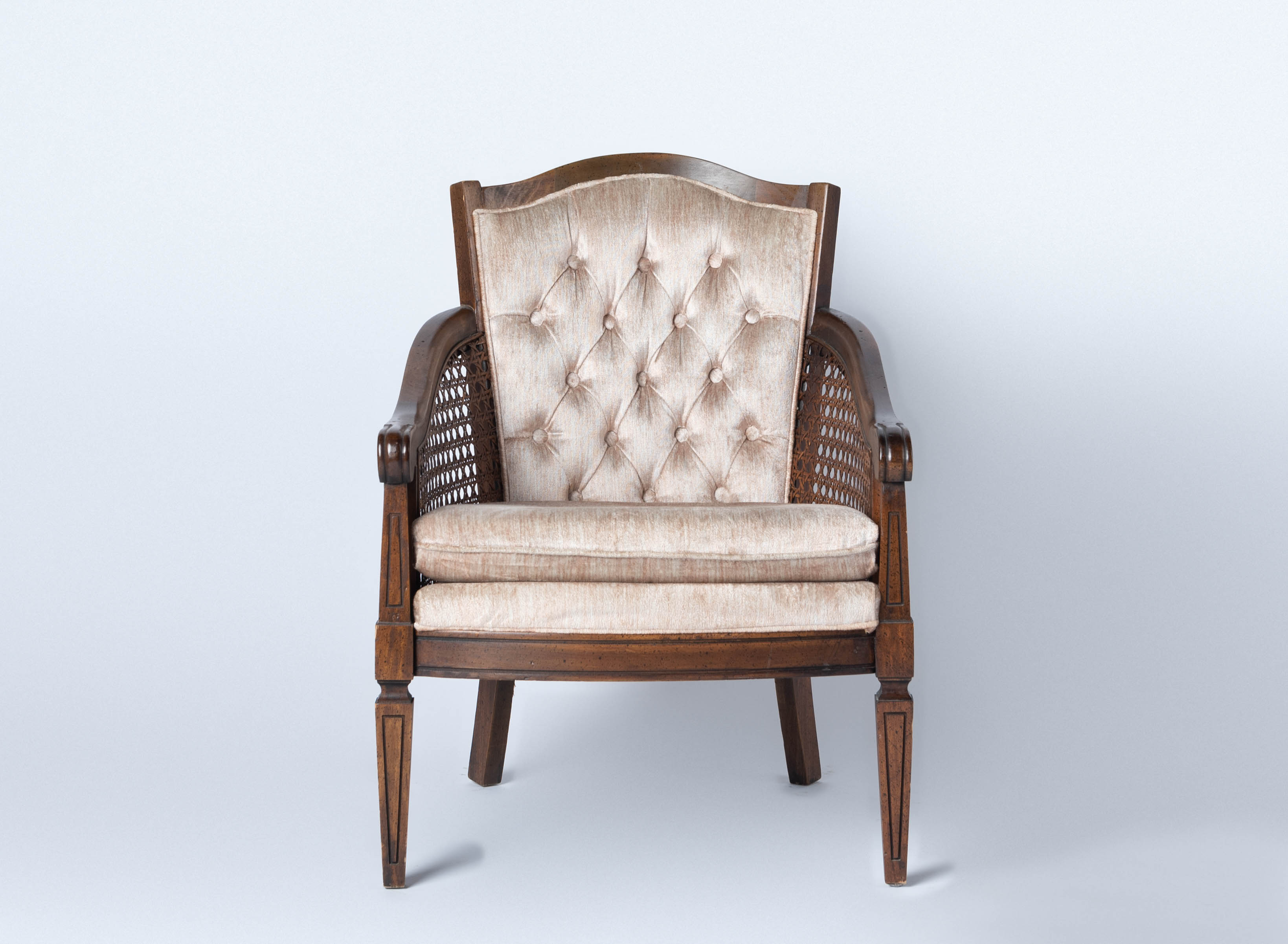 Shiny champagne-colored cane barrel chair