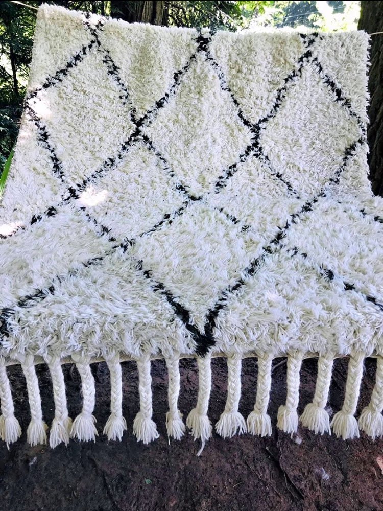 White wool rug with black geometric pattern