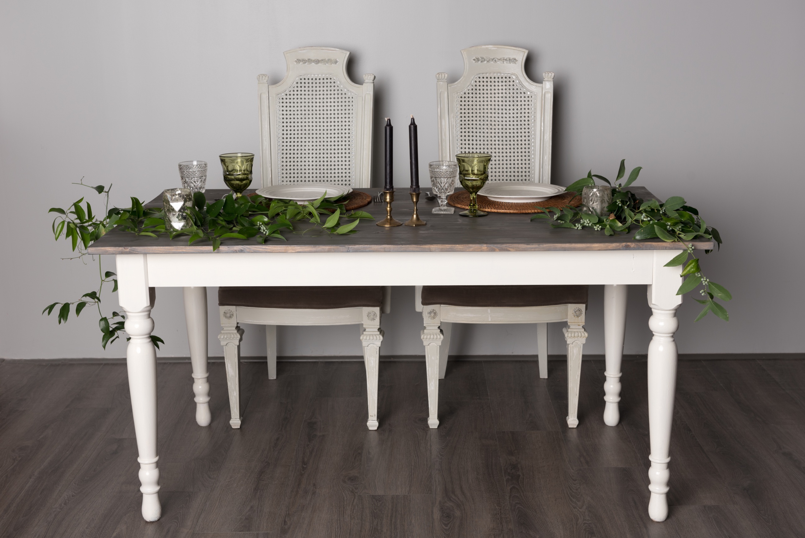Included are: 2 Melanie Chairs, Farm Table with Weathered Wood Top and Off White Legs, 2 vintage China dinner plates, 2 green vintage goblets, 2 clear vintage goblets, and flatware for two.