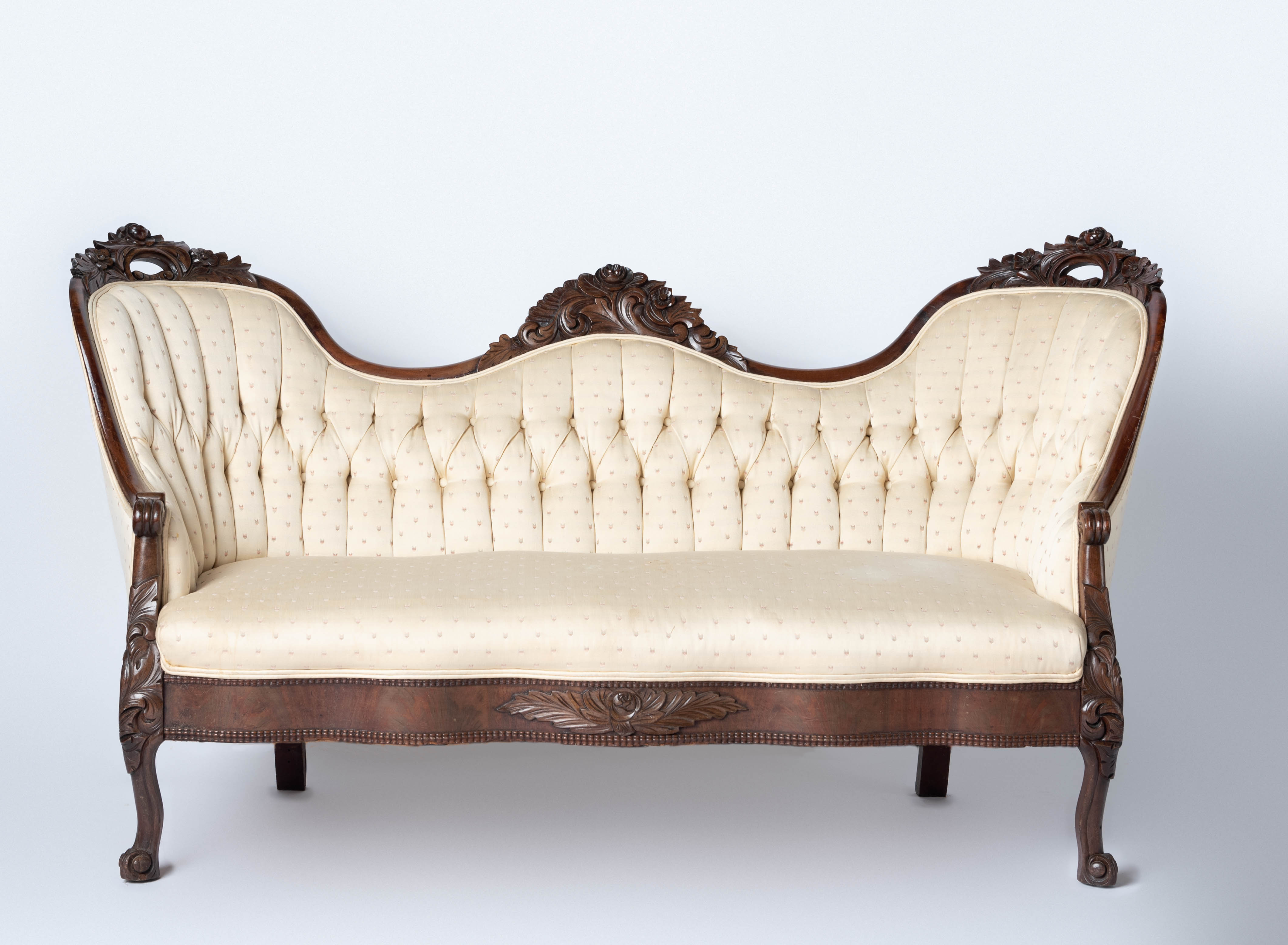 Cream-colored/off-white tufted Victorian settee